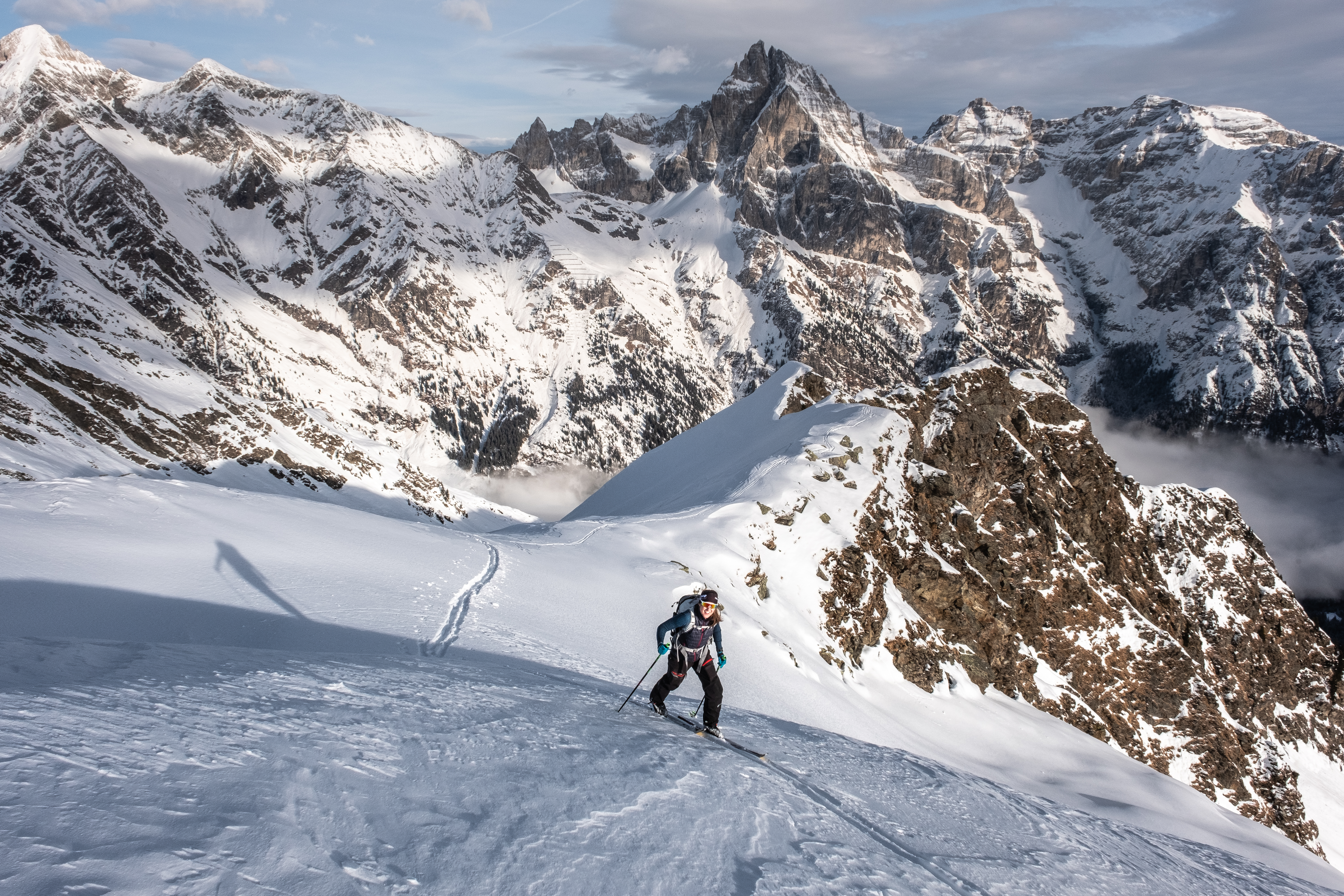 Einsame Spuren durch den frischen Schnee ziehen, mit den Fellen Schritt für Schritt dem Ziel entgegen, die fantastische Aussicht genießen und dann…tief durchatmen, sich stärken, Felle abziehen… und traumhafte Abfahrt im Pulverschnee genießen.